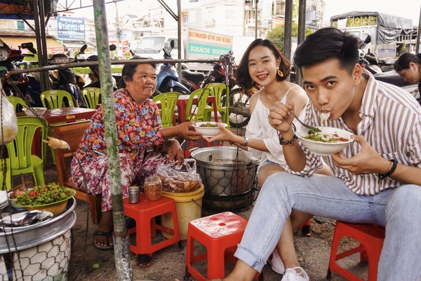 Nhân tiên cái sạp nhìn đẹp quá nên hai đứa làm quả ảnh “du lịch ẩm thực”