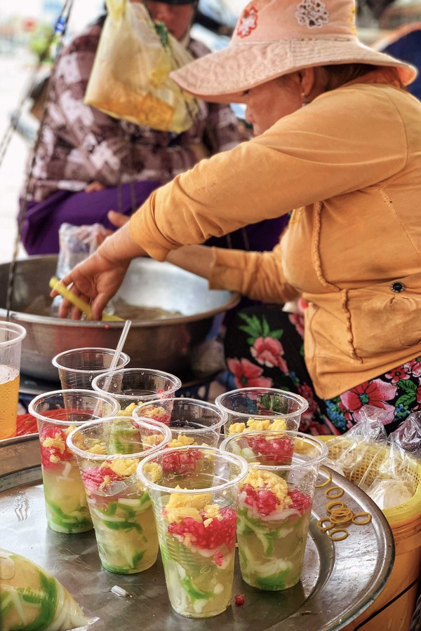 Bà chủ rất dễ thương, mời chúng tớ ăn thử gần hết cái sạp rồi còn bảo chụp đi con để bà trộn lên cho đẹp rồi chụp quảng cáo cho bà...